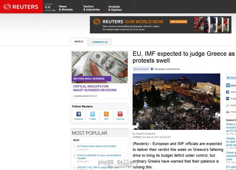 Στο ίδιο μήκος κυμαίνεται και το κείμενο του Reuters που αφορά τις εκδηλώσεις στην Αθήνα. Περίπου 30.000 κόσμου "είδε" η ελληνική αστυνομία και αναμετέδωσε το Reuters, το οποίο υπογραμμίζει: "Υποκινούμενοι από το Facebook, παρά από τα πολιτικά κόμματα και τα εργατικά συνδικάτα (οι Έλληνες) εναντιώθηκαν κατά των Ελλήνων πολιτικών και των ξένων δανειστών".