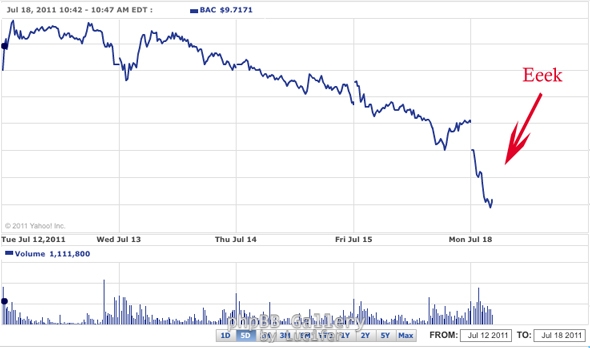 Όποιος είπε ότι η αμερικανική κρίση κατοικίας έχει τελειώσει πρέπει να δει το διάγραμμα τιμών της μετοχής της Bank of America, η οποία καταγράφει μεγάλη πτώση σε όλο το 2011 ενώ τη Δευτέρα βουλιάζει στη δημοσίευση ειδήσεων ότι η τράπεζα θα χρειαστεί να αυξήσει την κεφαλαιοποίηση της κατά 50 δις δολάρια εξαιτίας του μεγέθους της τρύπας που αντιμετωπίζει από τα επισφαλή στεγαστικά δάνεια.