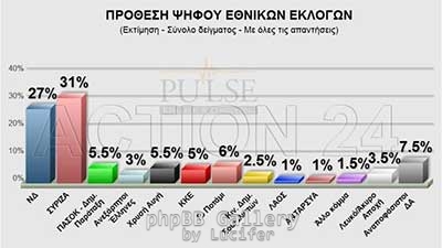Σύμφωνα με τη Pulse στην πρόθεση ψήφου με αναγωγή ο ΣΥΡΙΖΑ προηγείται με 32%, η ΝΔ 27,5%, το Ποτάμι 6,5%, Χρυσή Αυγή 6%, ΠΑΣΟΚ 5,5%, ΚΚΕ 5%, ΑΝΕΛ 3% και το ΔΗΚΙΣΟ 2,5%.