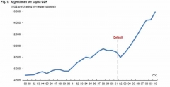 Το πιο κάτω διάγραμμα δείχνει το κατά κεφαλήν παραγόμενο ΑΕΠ της Αργεντινής. Η Αργεντινή επίσης αναγεννήθηκε από τις στάχτες. Αντί όμως για ιερά και εξαγνιστικά βότανα, χρησιμοποίησε περισσευούμενο κερδοσκοπικό κεφάλαιο για καύσιμο.