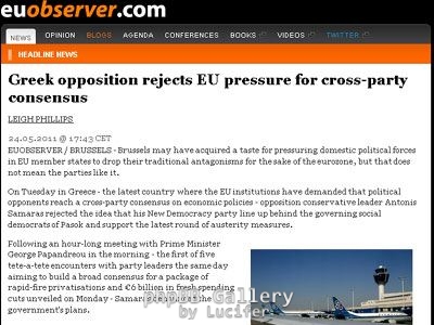 «Χθες στην Ελλάδα, ο συντηρητικός ηγέτης της αξιωματικής αντιπολίτευσης Αντώνης Σαμαράς απέρριψε την ιδέα να υποστηρίξει το σοσιαλιστικό κυβερνόν κόμμα του ΠΑΣΟΚ, σχετικά με τα νέα μέτρα λιτότητας», αναφέρεται στο δημοσίευμα. Συγχρόνως, επισημαίνεται ότι «μετά τη συνάντησή του, διάρκειας μιας ώρας με τον πρωθυπουργό Γ. Παπανδρέου - την πρώτη από τις πέντε συνολικά συναντήσεις που είχε με τους πολιτικούς αρχηγούς - ο κ. Σαμαράς απέρριψε τα κυβερνητικά σχέδια».